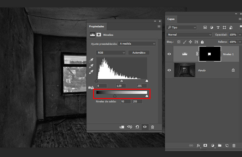 Ahora creamos una capa de ajuste de niveles e iluminamos desde los valores de salida para que quede difusa y como con bruma. (Ver imagen).