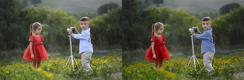Como os podéis fijar, en la imagen que he utilizado estaban muy marcados los amarillos de las flores, y muy pobre la camisa del niño y los verdes del fondo. Se han oscurecido tanto la camisa como el vestido de la niña para marcar los colores quitando iluminación, también las zonas verdes del fondo y se ha bajado también el amarillo de las flores. Ahora ponemos el modo de fusión de esta capa de ajuste en “luminosidad” y veremos el resultado con color. Ahora ya movéis los valores a vuestro gusto viendo el resultado. (Ver imagen).